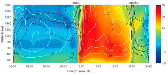 Time–height cross-section of radar products for 24 h from the CINRAD/SA at Daxing, Beijing, 2 May 2021. The fill color is (unit: dBZ); the black isopleths are valid data proportions; and the white isopleths are (unit: dB). The times of sunset and sunrise were 11:08 and 21:13, UTC, respectively.