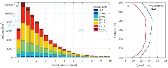 Some meteorological parameters were used in this study. The profiles of the air temperature, the relative humidity, and the absolute humidity were collected using a microwave radiometer (RPG-HATPRO-G5, Meckenheim, Germany). The range resolution of the microwave radiometer was 50 m for heights below 1 km, 100 m for heights between 1 km and 2 km, and 250 m for heights from 2 km to 10 km, and the temporal resolution was 1 s. The wind vertical velocity and the wind shear were retrieved using a 3D Doppler wind lidar (Windcube 100 s, Leosphere, Saclay, France). The wind measurement products had a spatial resolution of 25 m with a temporal resolution of 20 s, and the products were not used when the carrier-to-noise ratio was less than −30 dB. A radar wind profiler (RWP) CFL-06, which was manufactured by the 23rd Institute of the China Aerospace Science and Industry Corporation, was also used to detect and process the profiles of the horizontal wind speed and direction. The radar wind profiler operates in the L-band (1290 MHz) and provides data with a vertical resolution of 120 m for heights between 150 m and 2.9 km. The microwave radiometer, the wind lidar, and the wind profile radar were located several tens of meters from the S-band weather radar in the same observation field.
