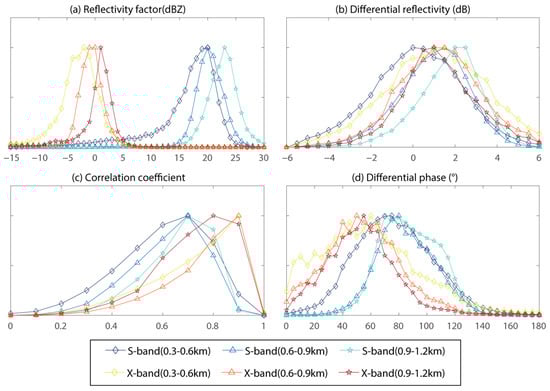 As shown in Table 2, the minimum detectable reflectivity of the CINRAD/SA and X-POLs was less than −7.5 dBZ at 50 km and 5 dBZ at 60 km. Therefore, balancing the minimum detectable reflectivity and the volume of the data, the range threshold of the data was 59 km for the S-band and 17 km for the X-band. The range threshold was set according to the radar equation to ensure that the radars with different wavelengths had the same minimum detectable reflectivity, which was −6 dBZ.