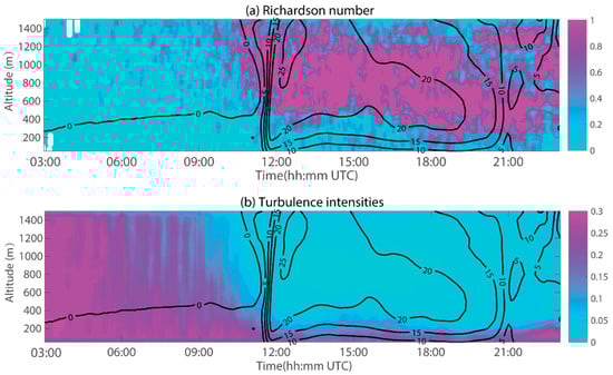 Turbulence intensities (a) and Richardson number (b) for 20 h at Daxing, Beijing, 2 May 2021. The black isopleth is the time–height cross-section of (unit: dBZ), which is the same as the fill color in Figure 6.