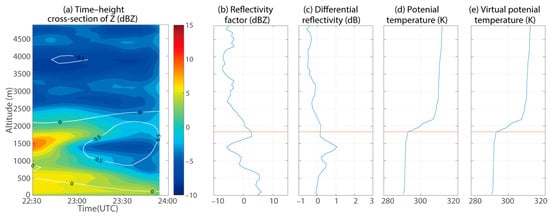 Yet despite all this, some scholars still express a slightly different point of view. They claim that the reflection from turbulent air at the S-band has been studied by some studies [,,,,], and it has been well established with polarization radars that turbulent air has values close to 0 dB at the S-band. However, these echoes were commonly observed at the top of the convective boundary layer (also called the entrainment layer). The entrainment layer is essentially static in stability. Due to the effects of penetrative convection and entrainment, thermals reciprocate in the layer []. The reciprocation brings turbulence generation on the one hand; on the other hand, the stable air brings the turbulence closer to a locally homogeneous isotropic state. Thus, the observed echoes can be regarded as special cases and cannot represent the whole characteristic of clear-air turbulent echoes. Figure 17 shows the vertical profiles of the values and rawinsonde data. It is observed that there is a layer of enhanced reflectivity at the entrainment layer, which is consistent with the known results [].
