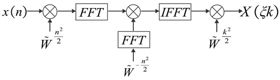 Equation (33) shows that, for each fixed l, is the scaled Fourier transform (SFT) of the signal . As we know, the SFT can be efficiently implemented by FFT-based chirp-z transform (CZT).