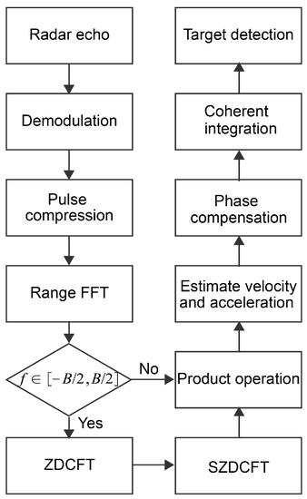 For the elimination of LRCM, many successful methods have been proposed. Representative methods involve the keystone transform (KT) [17,18], Radon Fourier transform (RFT) [19,20], axis rotation transform (ART) [21], scaled inverse Fourier transform (SIFT) [22], and frequency-domain deramp-keystone transform (FDDKT) [23], where the KT is a linear transform for eliminating LRCM of multiple targets without prior information. However, the KT may suffer from Doppler ambiguity, due to the high velocity and low PRF. The RFT and ART eliminate the LRCM through the two-dimensional search procedure, which may require a heavy computational burden. The SIFT and FDDKT can achieve the cancellation of LRCM with the help of the symmetric autocorrelation function, which can maintain a low computational burden at the cost of anti-noise performance. Nevertheless, the coherent gain of the above method can decline sharply, due to overlooking the QRCM and DFCM arising from the target’s acceleration.