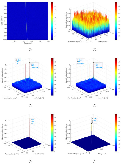 Figure 7 illustrates the coherent integration ability for a single target, where the motion parameters of the target are: initial range cell number st, radial velocity m/s, and radial acceleration m/s. The input SNR after PC is 20 dB. Based on Equations (27) and (28), we take and , to extend the estimation scopes of velocity and acceleration to [−150, 150) m/s and [−75, 75) m/s, respectively. Figure 7a displays the target motion trajectory after PC. It is apparent that serious RCM occurs to the target, due to the high velocity and acceleration. Figure 7b provides the result of MDCFT when MHz. It can be seen that the MDCFT fails because the motion parameters exceed the estimation scopes of MDCFT. Figure 7c,d show the results of SZDCFT when MHz. It can be observed that there are four peaks in each two-dimensional spectrum diagram. The true peak positions are the same, i.e., , while the false peak positions are interlaced. The result of PSZDCFT is depicted in Figure 7e. As predicted, the false peaks are removed, while the true peak is reinforced and recognized. Then, based on the location of the true peak, we obtain the estimated velocity and acceleration as being 120 m/s and 45 m/s, respectively. Finally, the estimated parameters are used to construct a phase compensation function, to eliminate the RCM and DFCM, and then the target energy can be well focused, in Figure 7f.
