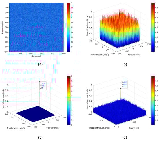 Figure 8 intuitively demonstrates the excellent ability of the product operation with respect to focusing energy and estimating parameters, in a low SNR environment. The input SNR is −8 dB after PC. Other parameters are identical to those in Figure 7. Figure 8a shows the result after PC, from which it can be observed that the target trajectory is completely annihilated in the noise. Figure 8b provides the result of SZDCFT at MHz. It can be noticed that the peak is not visible, which is not favorable for parameter estimation. In this regard, we perform a product operation for the SZDCFT results along the range frequency cells, to accumulate the signal energy dispersed in different range frequency cells, which is illustrated in Figure 8c. Comparing Figure 7c,d and Figure 8b, it is easy to see that the product operation still has a remarkable parameter estimation ability in the low SNR environment, which is also confirmed in Section 5.4. On this basis, coherent integration can naturally also be accomplished well, in Figure 8d.