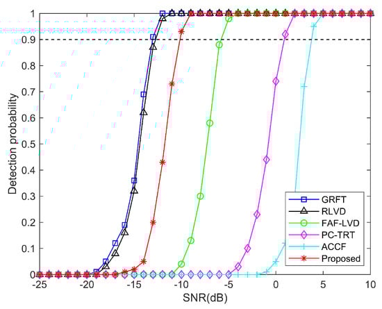 In this section, we evaluate the target detection capability of the presented method through Monte Carlo experiments. As a comparison, five other representative methods, i.e., RLVD, GRFT, FAF-LVD, PC-TRT, and ACCF, are also simulated. The constant false alarm rate (CFAR) technique, with false alarm rate , is used. The input SNR after PC varies from −25 to 10 dB, with a step of 1 dB. For each SNR value, 500 independent simulations are run. Figure 10 depicts the detection probability curves.