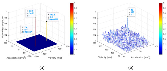 From Equation (29), it can be seen that there will be only true peak in the two-dimensional spectrum, while the false peaks are eliminated. Then, based on the peak location, we can obtain the velocity and acceleration of the maneuvering target as follows