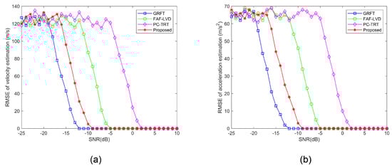 In this section, we evaluate the parameter estimation performance of GRFT, FAF-LVD, PC-TRT, and the presented method, by Monte Carlo experiments. For the sake of comparison, the ranges of the estimated motion parameters by the four approaches are set to be identical. The input SNR after PC varies from −25 to 10 dB, in steps of 1 dB. For each SNR value, 500 independent experiments are carried out. The root mean square error (RMSE) is used as the evaluation criterion. The RMSE curves for velocity and acceleration are plotted in Figure 12.