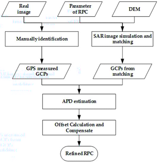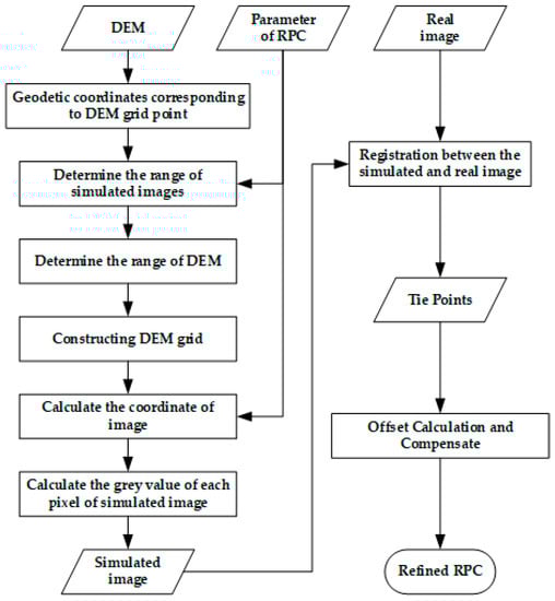 The SAR image simulation technology can generate an image similar to a real image in geometric and radiometric properties [,,,]. Since the accuracy of various parameters used for simulation and reference data is known, reliable GCPs can be obtained by real-to-simulated image matching. In areas with flat terrain, the simulation of SAR images usually needs to know the detailed parameters of the SAR system, as well as the types of ground objects and electronic characteristics. However, such information is not required in mountainous areas because the image grey value is mainly influenced by geometric distortions, including layover, shadow, and foreshortening []. Zhang G. et al. proposed an incoherent approach to generating SAR-simulated images using RFM []. As shown in Figure 2, this method involves three steps, outlined below.