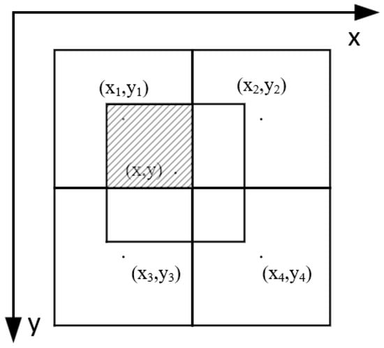 - Determine the backscattered power (grey value) of the simulated image. For one cell (X, Y, Z) in DEM, the coordinate of the corresponding pixel (x, y) in the simulated image can be calculated by using the RFM, and are grid points surrounding (x, y) (as shown in Figure 3). For each pixel in DEM, its contribution of grey value to four adjacent pixels is based on the size of the intersection area. As highlighted in Figure 3, the contribution of (x, y) to pixel is . Due to the imaging characteristics of SAR and the geometric distortions such as layover, perspective shrinkage, and shadow, the actual relationship may not be a one-to-one correspondence. Some pixels may have higher brightness when one pixel in the simulated image consists of multiple ground units [].