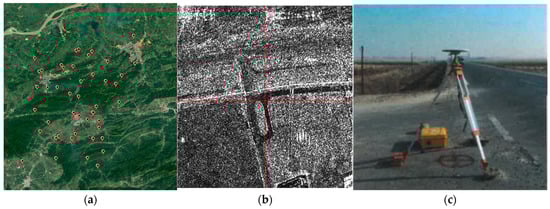 For GPS surveyed GCPs, a total of 45 points were collected in this area (as shown in Figure 5), evenly distributing on each image, and the accuracy of these GCPs is about 10 cm in ground space. Manual identification of GCPs always brings some errors, especially on SAR images. As far as possible to reduce such errors, the principle of selecting GCPs is to select the intersection point or inflection point of the road or other strongly reflective objects [].