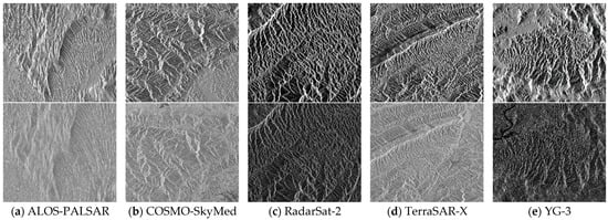 where is the incidence angle. Taking the incidence angle of 30°, for example, an error of 2 m in elevation can provide a slant error of 2.309 m. For a simulated image with a sample spacing of 5 m, the error generated is no more than one pixel. In other words, for ALOS, the errors introduced by the DEM used in the simulation procedure were less than 1 pixel, and for COSMO-SkyMed and YG-3, the errors were around 1 pixel.