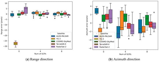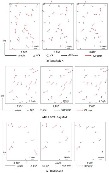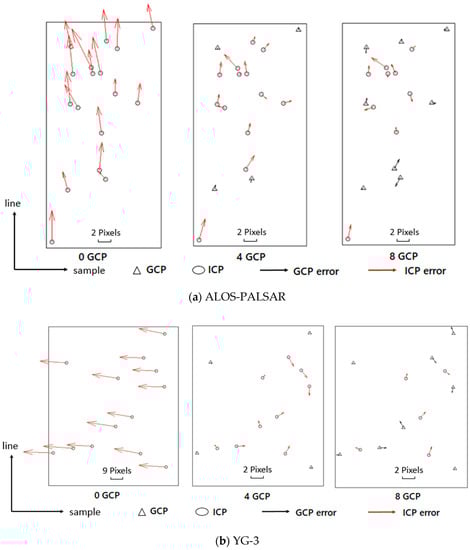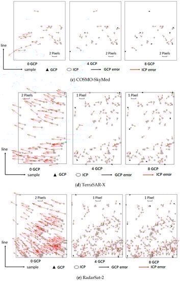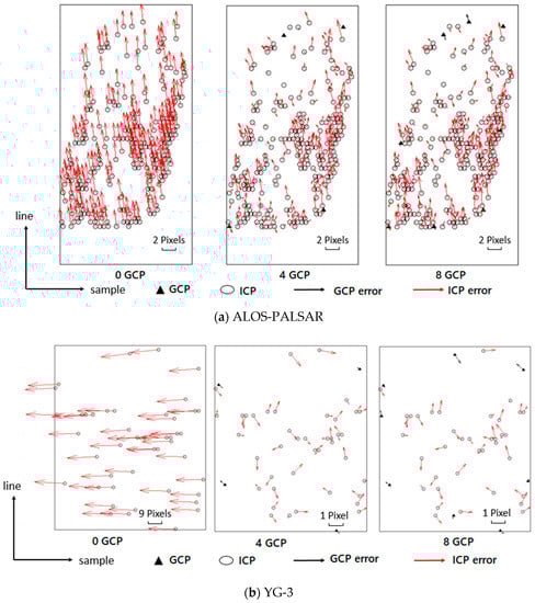 With four GCPs laid in the corners, the results of YG-3 and ALOS-PALSAR were significantly improved to the 2-pixel level, as shown in Figure 9 and Figure 10, while the errors of COSMO-SkyMed, TerraSAR-X, and RadarSat-2 slightly changed. When more GCPs were added, the RMSE of all images remained larger than 1.2 pixels.