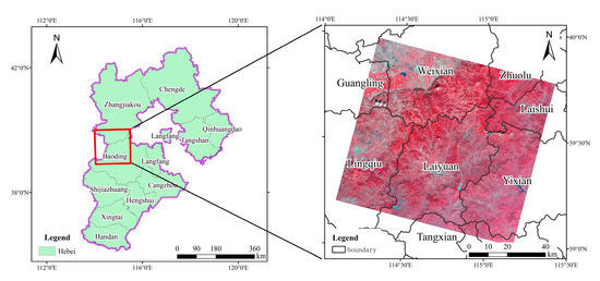 In this study, Laiyuan County and its surrounding areas are selected as the study area, located northwest of Baoding, Hebei Province, as shown in Figure 1. Hebei Province, which is rich in mineral resources, has the largest number of tailings ponds in China, with various types of tailings, concentrated distributions and high potential risks [21]. At the same time, there are similar ground objects to tailings ponds in this area, such as reservoirs, bare rocks, etc., which significantly affect the precise extraction of tailings ponds. Therefore, the selection of this region is precious for verifying the algorithm’s performance and the actual regulatory needs.