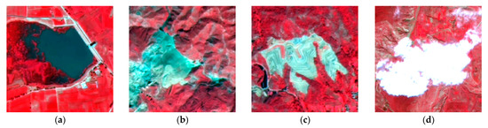 During the model identification of tailings ponds, it is found that there are many misidentifications because some natural or artificial objects were easily confused with tailings ponds. To reduce the false detection of these objects as tailings ponds, we collect 280 of them and mark them as negative samples. Figure 4 shows some examples of negative samples of tailings ponds. Negative samples collected can be mainly divided into four categories in this study area: water reservoir, bare rock, bare land, and cloud.