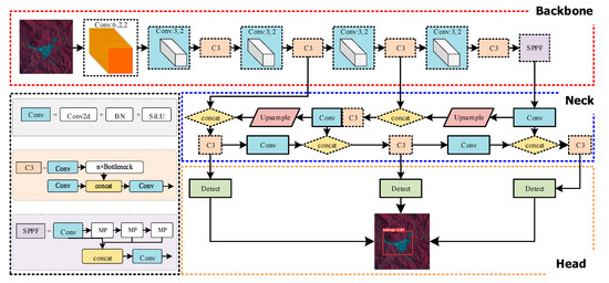 The YOLO family has many models, but they perform differently on different datasets. YOLOv5 is easy to deploy and train, has good reliability and stability [27]. At the same time, Web of Science shows that in the past year, YOLOv5-based publications have an absolute advantage and are widely used. Therefore, YOLOv5 is still highly competitive and is chosen in this study for further improvement. YOLOv5 is a prevalent deep learning framework that includes five network models of different sizes: s, m, l, x, and n, which represent different depths and widths of the network. YOLOv5 treats the detection task as a regression problem, using a single neural network to directly predict bounding boxes and classes. Figure 5 shows the network structure of YOLOv5 (v6.0), which is the latest version of YOLOv5. The whole network consists of three basic parts: Backbone, Neck, and Head. Before being fed into the backbone network, the input images are processed with mosaic data augmentation, adaptive image scaling, and adaptive anchors. In this study, the anchor boxes are automatically adjusted to (12,481, 87,128, 147,141), (239,128, 159,221, 289,274) and (343,524, 558,371, 583,587).