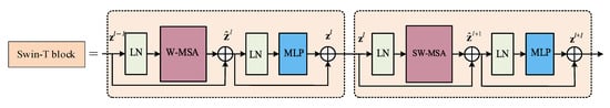 In the entire GF-6 image, a large number of small-sized tailings ponds are in general sparsely and non-uniformly distributed, and it is difficult to distinguish them from the surrounding background, which makes tailings ponds extraction challenging. The YOLOv5s model with the C3 module cannot overcome this deficiency well because it lacks the ability to obtain global and contextual information [29], but the transformer can better integrate the semantic information of the contextual and global features, and has a good recognition effect for sparse small targets with complex backgrounds [30,31]. Due to the high-cost calculation of the transformer, Swin Transformer [32] is selected to improve the backbone network of YOLOv5s. The Swin Transformer block is the core of Swin Transformer, mainly composed of two multi-head self-attention (MSA) modules, window-based MSA (W-MSA) and shifted-window MSA (SW-MSA), followed by a 2-layer multilayer perceptron (MLP) with GELU nonlinearity in between. A LayerNorm (LN) layer is applied before each MSA module and each MLP, and a residual connection is applied after each module, as shown in Figure 6. W-MSA uses regular windows to evenly partition the image in a non-overlapping manner, and computes self-attention within each local window. Therefore, W-MSA has linear computational complexity with respect to input image size, rather than a quadratic complexity of the transformer. Although W-MSA reduces the computational effort, it lacks connections across windows. SW-MSA realizes the information interaction between adjacent windows through a shifted window partitioning approach, and finally realizes the perception of global information. To embed the Swin Transformer block into the backbone, inspired by the work of C3NRT [29] and C3-Trans [30], we propose a new C3Swin-T module, which replaces the original Bottleneck block in C3 by the Swin Transformer block. All C3 modules of the original backbone are replaced by C3SwinT to build a new Swin Transformer backbone (Swin-T backbone), while other layers keep the same, and the structure is illustrated in Figure 7.