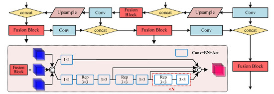 The role of the neck is to better integrate the features extracted by the backbone at different stages to improve the ability of the model to detect features at different scales. YOLOv5s adopts the neck of the FPN+PAN structure. To achieve a better fusion effect, some heavier necks were designed, which increase the computation and memory footprints [33]. In our work, we no longer seek to design a new neck module to avoid more connections and fusions among feature pyramids. We adopt a strategy of replacing some modules of the original neck structure. DAMO-YOLO proposed a novel Efficient-RepGFPN, which improves the model effect by optimizing the topology and fusion of the original GFPN [34]. Additionally, DAMO-YOLO uses the designed fusion block module to improve the low efficiency of node stacking operations and realize the optimization of fusion features. Inspired by this, we replace the C3 module with the fusion block module to improve the feature fusion effect of the model. The fusion block is illustrated in Figure 8. The input of the fusion block is two or three layers. After concat, the number of channels is adjusted on two parallel branches through 1 × 1 Conv. The branch below introduces the idea of the feature aggregation module of efficient layer aggregation networks (ELAN), which consists of multiple Rep 3 × 3 Convs and 3 × 3 Convs. Finally, the outputs of different layers are concat and output. Based on the introduction of various strategies such as CSPNet, reparameterization mechanism and multi-layer aggregation, the fusion block greatly improves the effect of feature fusion. Based on the excellent performance of the fusion block, we replaced the four C3 modules in the neck of YOLOv5s with the fusion block to build a new neck called RepGFPN Neck.
