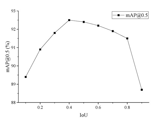 To investigate the effect of the IoU threshold of GNMS on the accuracy of tailings ponds detection, different IoU thresholds are selected to obtain the best mAP@0.5 on the test set. The IoU threshold ranges from (0, 1) with a step size of 0.1, and the results are shown in Figure 12. Figure 12 shows that the mAP@0.5 is maximum when the IoU threshold is 0.4.