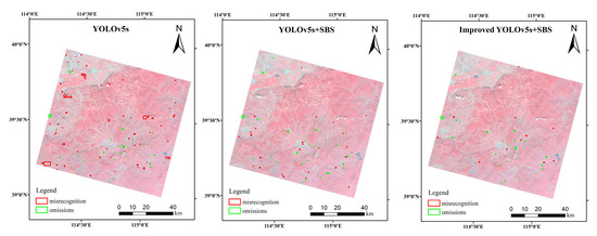 In order to overall compare the performance of the three models, we show the results of misrecognition and omissions of different models, respectively, on the entire GF-6 image. Red detection frames represent misrecognition, and green detection frames represent omissions. From Figure 16, the misrecognition of YOLOv5s is the highest, followed by YOLOv5s+SBS, and our framework has achieved the best performance. YOLOv5s has about the same number of omissions as our framework, while YOLOv5+SBS has relatively more omissions.