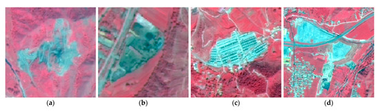 Examples of negative samples in the GF-6 image. (a) Water reservoir, (b) bare rock, (c) bare land, and (d) cloud.