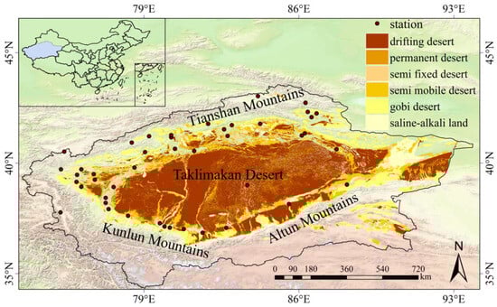 Overview of the study area and distribution of meteorological stations (desert distribution dataset is provided by National Cryosphere Desert Data Center (http://www.ncdc.ac.cn, accessed on 1 June 2022). The standard map No. GS(2017)1267.