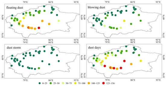The annual number of dust days in the entire Tarim basin is 60 days, including 52 days for floating dust, 21 days for blowing dust and 5 days for dust storm. Figure 4 shows that the number of days of dust weather is relatively high, mainly in Pishan, Hotan, Cele, Minfeng and Tazhong. The days of dust weather exceed 125 days, and the maximum is 156 days (in Minfeng). The loose soil on the surface of the Taklimakan Desert, as the material base, can easily produce dust weather [38,39]. The number of dust days in Shache, Luopu, Qiemo and Yutian is 100–125 days. The high value areas of these dust weather days are mainly distributed in the southern margin of the Tarim Basin and the stations in the hinterland of the desert. The area in the north near the southern foot of Tianshan Mountains has a low number of dust days at less than 50. The number of dust days in the Kashgar region in the west is slightly higher due to the influence of the westerlies. Except for several high-altitude stations near the Pamirs Plateau; the number of dust days is 75–100 days. Floating dust is the dust weather type with the highest frequency for many years. The distribution of floating dust with high frequency is similar to the spatial distribution of the total dust days. Hotan (149 days) and Minfeng (153 days) in the southern margin of the Tarim Basin have the highest floating dust frequency. Basically, floating dust exists in every dust weather. The annual average frequency of blowing dust is 0–82 days, with the highest occurrence recorded by Tazhong Station (82 days). The second highest is the line from Pishan to Ruoqiang, at which the frequency of blowing dust at most stations is 25 to 50 days. The lowest frequency of dust storms, with an annual average frequency of 0–27 days and the highest frequency of 27 days, was recorded by Minfeng Station. The frequency of three kinds of dust weather in Bayinbuluke, Baluntai, Hejing, Yanqi, Baicheng, Turgat and Tashkurgan is relatively small, and the frequency does not exceed 10 days. Particularly, Baluntai and Bayinbuluke are located on the southern slope of the Tianshan Mountains, and their special location and terrain conditions make them rarely affected by dust weather. Strong winds, dust sources and unstable weather conditions are important conditions for dust transmission, and terrain affects the airflow transmission path [10]. Affected by the topography and prevailing wind direction of the Tarim Basin, a small part of the dust is transported eastward, and most of it stays inside the basin and has greater impact on the southern edge of the basin [40].