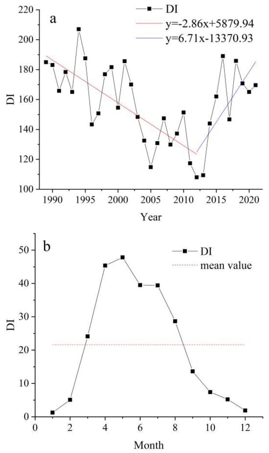 Interannual and monthly variation in DI in Tarim Basin, (a) Interannual variation; (b) monthly variation.