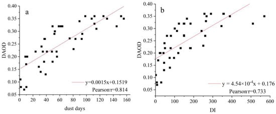 (a) Correlation analysis of annual average DAOD and dust weather days at 44 stations from 1989 to 2021; (b) Correlation analysis of multi-year average DAOD and DI.
