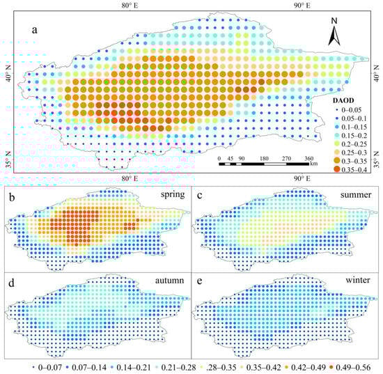 Spatial Distribution of DAOD in Tarim Basin from 1989 to 2021, (a): Multiyear average DAOD; (b–e): DAOD in different seasons.