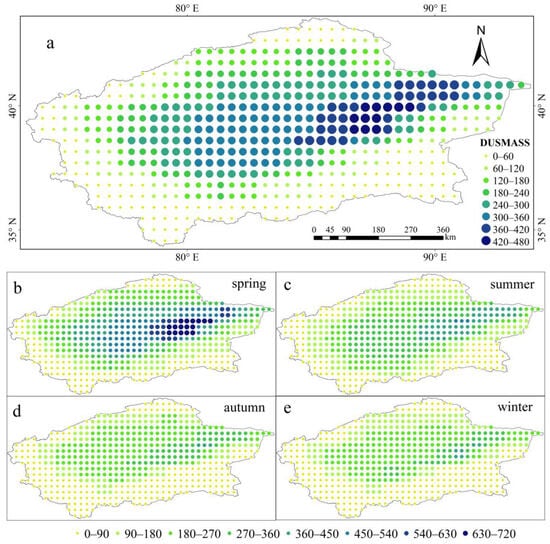 Distribution of dust surface mass concentration (μg·m−3) in the Tarim Basin from 1989 to 2021, (a) DUSMASS multi-year average distribution; (b) DUSMASS in spring; (c) DUSMASS in summer; (d) DUSMASS in autumn; (e) DUSMASS in winter.