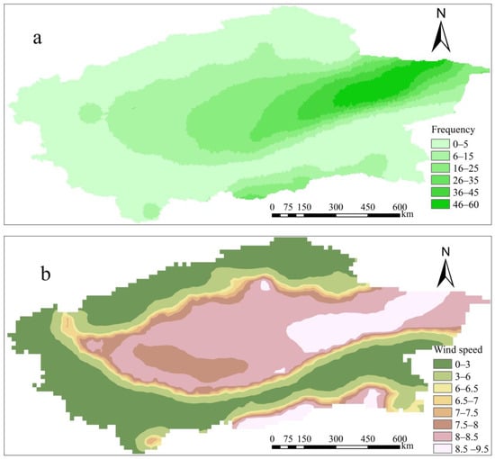 The wind speed of sand rising in the Tarim Basin is 6 m/s [63]. This paper classed gale weather as having a wind speed greater than 6 m/s and a duration of more than 12 h. Figure 10 shows the occurrence frequency and multi-year average wind speed of gale weather under these conditions. It can be seen from the figure that the frequency of gale weather for many years presents a stepwise decreasing trend from northeast to southwest. The most frequent gale weather is in the northeast. The frequency of gale weather is low at the southern foot of the Northern Tianshan Mountains, the northern foot of the Southern Kunlun Mountains and the Pamirs Plateau. This distribution is basically consistent with the spatial distribution of the DP and RDP of Sun and Gao [64]. The annual average wind speed and frequency distribution of gale weather are different, but the high average wind speed occurs at the tuyere in the northeast of the desert, followed by the Hotan area in the south of the basin and the edge of the desert. Whether from the frequency or intensity of strong wind weather, wind erosion in the eastern region is very strong. The unique geographical position of the Taklimakan Desert leads to the unique upper air circulation situation, determining the characteristics of the near-surface wind field. From the perspective of the planetary wind system, the upper air circulation in the Taklimakan Desert is mainly affected by the mid-latitude westerly belt. However, it is surrounded by mountains on three sides, and the impact of the Qinghai–Tibet Plateau leads to the destruction and reconstruction of the latitudinal circulation. The entire desert is mainly affected by the northeast and northwest wind systems. The east wind and northeast winds are strong, and the affected area is mainly the east of the desert, while the north is less affected by dust [65]. The direction and intensity change of the near-surface wind field is also related to the great difference in the thermal properties between the desert and the surrounding different underlying surfaces. In particular, the desert becomes a huge heat source in summer, forming a large temperature gradient with the edge areas, leading to the convergence trend of the surrounding wind system with the desert hinterland and the gradual increase in this process [66]. In spring and summer, the wind generated by the hot low pressure formed in the Taklimakan Desert and the invading cold air is the dynamic condition for the formation of dust weather. The cold high pressure enters the Southern Xinjiang basin from the Pamirs plateau, making the surface uneven in heat and cold and forming a westerly wind in the Southern Xinjiang basin. In recent years, the dust weather in Hotan has shown a decreasing trend, mainly because the temperature has increased year by year, the cold air invading from the Pamirs has decreased, and the weakening of the low pressure in Xinjiang has led to the reduction of the westerly wind in the Tarim Basin, decreasing the dust weather [67]. The seasonal variation in dust aerosols in the Tarim Basin is similar to that in the Aral Sea region, mainly because they are at the same latitude. The frequent occurrence of mineral dust and salt dust is caused by the cyclone activity and strong wind weather in spring [68]. The impact of wind on dust is complex and dynamic, rather than a simple linear relationship. In future research, we should further study the relationship between wind and dust release in a single dust event and intensively discuss the interaction between various meteorological factors in the process of dust weather to provide a theoretical basis for wind–sand control and prevention in arid and semi-arid regions.