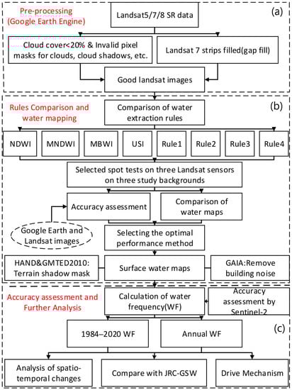In order to clearly express the workflow, we created a general flowchart framework consisting of three steps (Figure 3). Firstly, we collected remote sensing data on the GEE platform and pre-processed the images. Secondly, we performed a comparison and validation of each water detection rule, followed by the selection of the best rule and water body mapping. Finally, we performed accuracy verification, an analysis of the spatial and temporal dynamics of water frequency and drive mechanism analysis. The details are described in the following sections.