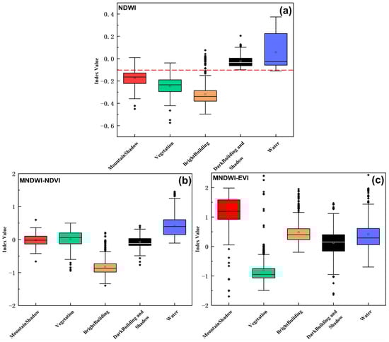 The box plot of five types of pixel index values for mountain shadows, vegetation, bright buildings, dark buildings and shadows, and water. (a) NDWI. (b) MNDWI-NDVI. (c) MNDWI-EVI.