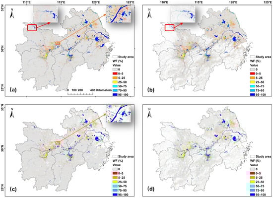 The range of WF is from 0% to 100%, and any pretzel noise pixels are masked by pixels with WF > 0. In a previous study [], 5% and 75% were used as breakpoints for the extraction of ephemeral, seasonal and permanent water bodies in the US. In this paper, 5%, 25%, 75% and 95% are used as breakpoints (Table 2). Specifically, pixels with 95% < WF ≤ 100% were classified as permanent water bodies; pixels with 75% < WF ≤ 100% were classified as year-long water bodies; pixels with 25% < WF ≤ 75% were classified as seasonal water bodies; water pixels with 5% < WF ≤ 25% were classified as temporary water bodies, which are inclined to become seasonal water bodies; and water pixels with 0 < WF ≤ 5% were classified as temporary water bodies.