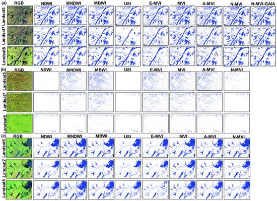 Performance of the 8 water body algorithms applied to different images of Landsat 5/7/8 in the city (a), mountainous areas (b) and rice fields (c). The RGB images of Landsat correspond to the shortwave infrared-1, near infrared and red bands, respectively.