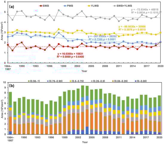 The trend in the area changes for each water body type and each water body frequency can be seen in Figure 6a,b. For the three water body types, PWB, YLWB and SWB+YLWB, in Figure 6a, the water area changes are roughly divided into three stages. The change trend is not obvious before 1998, and the overall trend is a decreasing one. In 1998, when a major flood occurred in the Yangtze River basin, the areas of all types of water bodies increased significantly. After 1998, the areas of these three types of water bodies generally showed a decreasing trend, and, in 2011, the water area decreased to the lowest point, which can be related to the vigorous economic development and encroachment of agricultural land and urban construction upon water bodies during this period. After 2011, the area of each water body type increased to some extent, which may be related to the policy asserting that “Lucid waters and lush mountains are invaluable assets” in this time period, when the government strengthened the protection of water bodies. The area of SWB changed frequently, a finding that is consistent with the typical climate change conditions in the region, and its area generally tended to increase, almost drawing level with the permanent water in 2020. The area of PWB, YLWB declined significantly during the study time, with p < 0.01. The p-values for the other two water types are greater than 0.05, which is not statistically significant.