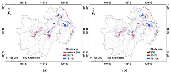 In this section, our WF results are compared with the ‘occurrence’ layer of JRC []. JRC Global Surface Water Mapping Layers v1.3 is a water body dataset with a 30 m spatial resolution generated through Landsat 5/7/8 images taken from 1984 to 2020. In general, the spatial distribution patterns of open-surface water bodies are consistent between the two datasets, especially in the [25–75], [75–100] frequency range (Figure 9). However, due to the differences between the water extraction methods, the area differences between the two datasets in the [0–5] interval are quite large (Figure S5).