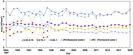 Comparison of the MLYP’s yearly open water body area with the JRC v1.3 data (the red dots in the figure represent the yearly data of the JRC errors in the MLYP).