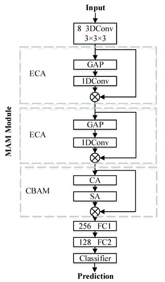 To exert the potential value of critical features that significantly impact the classification results, multiple attention modules were embedded into a 3DCNN. On the one hand, as a local cross-channel interaction strategy without dimension reduction, ECA can significantly improve network performance and avoid the adverse effect of compression and dimensionality reduction on the dependence between learning channels [45]. On the other hand, as a lightweight general module, a CBAM can be integrated into any CNN by adding a channel attention (CA) mechanism and a spatial attention (SA) mechanism to emphasize the channel and spatial characteristics [46]. In addition, HSIs have spectral data in hundreds of dimensions, resulting in complex channel states in the network, so double ECAs were inserted in the CNN and proven to be more effective in learning channel attention than one ECA through experiments. The main structure of the proposed MAM-3DCNN for HSI classification is illustrated in Figure 5.