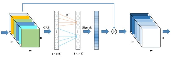 The specific structure of ECA. The input feature maps’ height and width are represented by H and W, and C is the number of channels. p represents the required adjacent channels to obtain the cross-channel interaction information of each channel and can be adaptively determined via a mapping of C. Sigmoid is the activation function.