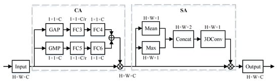 The convolutional block attention module is composed of spatial attention and channel attention in series, as shown in Figure 7. In the CA of the CBAM shown in Figure 8, the global average pooling (GAP) and global maximum pooling (GMP) are firstly used to aggregate the spatial information of the input feature map, then the number of channels is compressed to C/r, with r being the compression ratio to reduce the parameter overhead, and the channel feature vectors can be obtained by elementwise summation finally. As a supplement to the channel attention, in the SA, the average pooling and maximum pooling are performed and an effective feature descriptor is generated by connecting the results, then a standard convolutional layer connection and convolution are combined to generate a 2D spatial attention map.