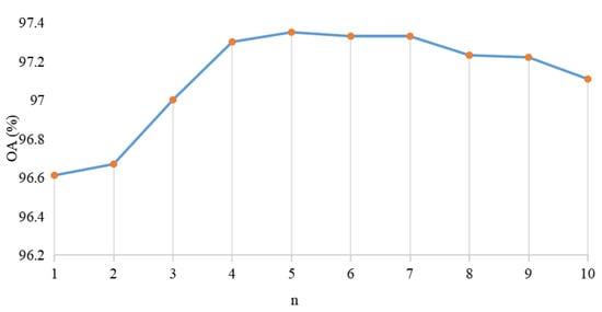 Since the purpose of DSR enhancement in this paper was to improve the classification accuracy of ground targets in shadow areas, the OA was used to measure the rationality of the parameter settings. With a, b, , and from 0 to 5 and n from 1 to 10, the enhanced image can be acquired by fusing the shadow area processed by 2D DSR with the non-shadow area and then classified by the 3DCNN. According to the above principle, the appropriate parameter for the HYDICE image in Figure 9 can be set as = = a = b = 0.01 and n = 5. The OA values under different n are shown in Figure 10.