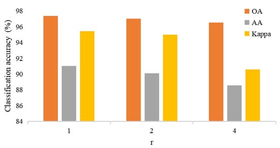 Comparison of classification accuracy under different rs. The best result of the OA, AA, and Kappa can be obtained when r = 1.