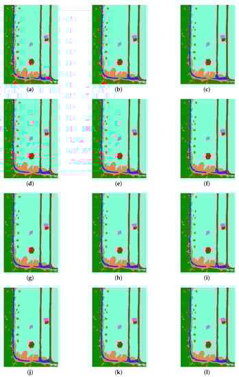Classification results: (a) 2DCNN; (b) GAB-2DCNN; (c) MAM-2DCNN; (d) 3DCNN; (e) GAB-3DCNN; (f) CBAM-3DCNN; (g) SE-3DCNN; (h) DA-3DCNN; (i) ECA-3DCNN; (j) DECA-3DCNN; (k) ECA-CBAM-3DCNN; (l) MAM-3DCNN.