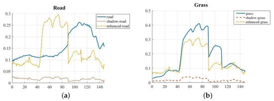 As shown in Figure 14, the spectral curves of road and grass in the shadow area before and after 2D DSR enhancement are plotted, respectively. It can be observed that the enhancement effect was obvious; specifically, the spectral curve of enhanced grass showed a similar trend for non-shadow grass in Figure 14b.