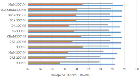As shown in Table 5, benefiting from large samples, all considered methods had a good performance on grass classification. Compared to the 2DCNN and 3DCNN, the attention mechanism had a particular effect of improving the network’s performance. Because the 3DCNN can make full use of the 3D data characteristics of HSIs, the classification effect of the method based on the 3DCNN was better than that based on the 2DCNN. Although the GAB-3DCNN, 3DCNN, and ECA-3DCNN performed better on road, road in shadow, and grass in shadow than the other methods, with an overview of all labels, the classification effect of the MAM-3DCNN was prominent. In addition, the MAM module improved the OA and Kappa values of the 3DCNN by 0.3190% and 0.5421%. According to the classification accuracy of the different methods shown in Figure 15, the proposed method performed better than the other considered methods under the evaluation of the OA, AA, and Kappa, among which the AA values were the lowest. Only the AA values of the 3DCNN and MAM-3DCNN were close, but the difference between the AA value of the MAM-3DCNN and the best AA value was only 0.0493%.