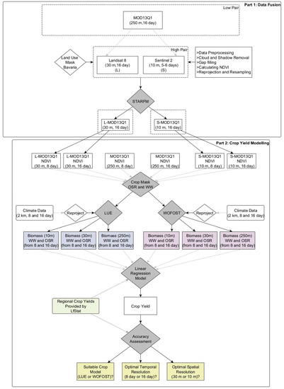 In the current study, the STARFM-based synthetic NDVI time series for the application of agriculture is selected from [4,5], where the fusion of MOD13Q1 (20 m, 16 days) is individually achieved with Landsat (30 m, 16 days; L) and Sentinel-2 (10 m, 5–6 days; S). Therefore, intending to investigate the importance of synthetic and real NDVI products with a different spatial and temporal resolutions, this research paper compares other output products which calculate the crop yield of winter wheat (WW) and oil seed rape (OSR) for Bavaria in 2019. The crop yield output of six different RS products (real: MOD13Q1 (250 m, 8 and 16 days); synthetic: L-MOD13Q1 (30 m, 8 and 16 days) and S-MOD13Q1 (10 m, 8 and 16 days)) with two widely used CGMs (WOFOST and LUE), for the respective crops, is tested. Eventually, for accurate crop yield modelling of WW and OSR in 2019, this study answers three research questions: