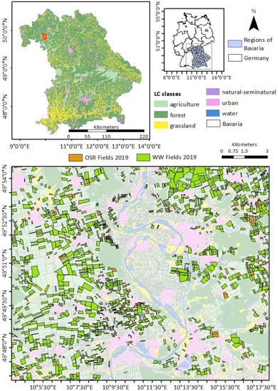 An overview of the study region. The LC map of Bavaria is obtained by combining multiple inputs of Landcover maps, such as Amtliche Topographisch-Kartographisches Informationssystem, Integrated Administration Control System (provides the crop field information), and Corine LC, into one map. Agriculture (peach green) dominates mainly in the northwest and southeast of Bavaria, while forest and grassland classes (dark green and yellow, respectively) dominate in the northeast and south. The district map of Bavaria overlays the LC map. The enlargement (displayed with a dark red box on the top right map) shows the urban area of the town Volkach, including the oil seed rape (OSR) fields (dark orange) and the winter wheat (WW) fields (dark green). A brief description of the regions of Bavaria is shown in Figure A1.