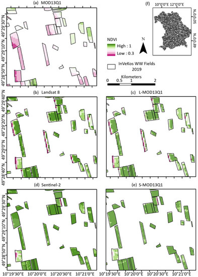 Both synthetic products underestimated the NDVI values compared to their actual NDVI products between DOYs 81 and 145 (Figure 5a). From DOYs 145 to 177, Landsat, L-MOD13Q1, Sentinel-2, and S-MOD13Q1 achieved a mean NDVI of approx. 0.71. The median NDVI values of L-MOD13Q1 and S-MOD12Q1 lie close to their respective high pair product (Figure 5b).